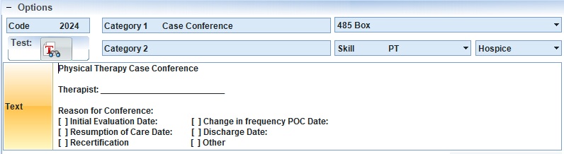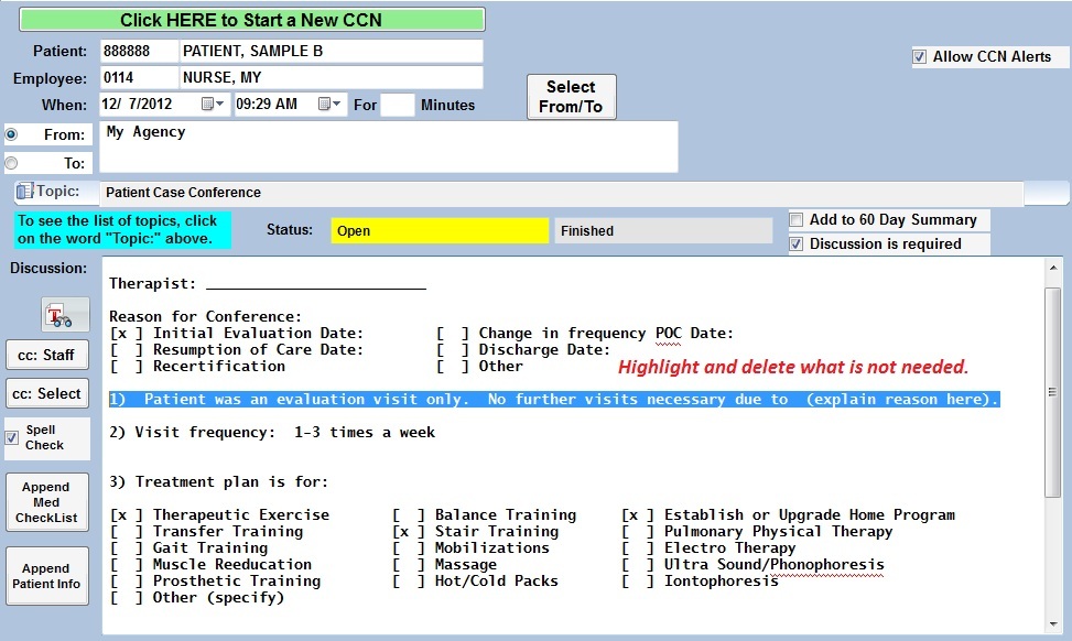 Example 2: A good example is a patient case conference note. You can create a new Text Item code for each discipline case conference note. Insert the codes into a care coordination note, deleting and adding information as needed. This can be done by the primary employee or data entry. You can CC any other Barnestorm user for them to view or you can print the care coordination note for non-Barnestorm users or outside sources.