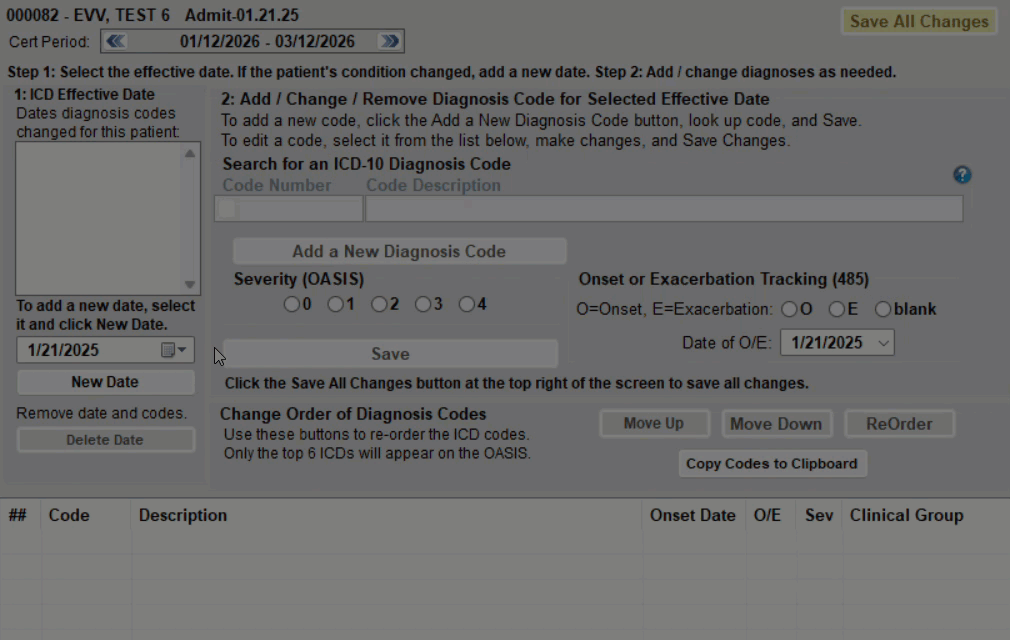 ImportantThe ICD effective date must be on or before the patientโs admit date. The admit date displays at the top of the ICD History screen.In most cases, the ICD effective date should default to the admit date.